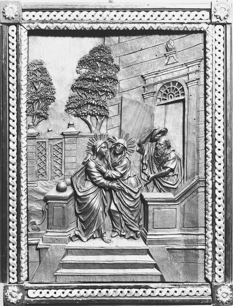 Curator: This is a particularly striking pair of overdoors from a porte cochère, created between 1673 and 1683, possibly by Jean Richer. What do you notice first about it? Editor: The dominant, almost severe, presence of the central female figure holding that rather large sword. The relief’s sharp contrast gives it a weighty feel, even though it’s ultimately decorative, intended for... above a doorway. Curator: Exactly. It's crucial to understand the social context here. This sculpture would have visually reinforced notions of power and authority associated with the elite. Who do you think she is? Editor: She's obviously a classic allegorical figure, probably Justice, or perhaps even Minerva herself, given the Roman influence. The sword certainly emphasizes power and judgement. What is fascinating, though, is the presence of Cupid, a classical god that normally softens the imagery in Renaissance and Baroque iconography but somehow here it looks even more intense with Cupid below. Curator: That's an insightful observation. While appearing traditionally ornamental, her sword represents something greater when situated within its social sphere. It could be read as more aggressive when reflecting on colonial implications from France during this period. These symbolic elements were used as statements, dictating the role and position of certain members within society. Editor: Absolutely. The motifs tell stories beyond their face value. Justice, the rose garlands, and that infant Cupid are a concentrated collection of symbolic associations that spoke to cultural values back then and allow us to read different associations in relation to current issues now. Curator: Considering the period of origin, the baroque theatricality also has roots in classical-realism. It provides visual cues on understanding hierarchical dynamics still permeating our lives today. The material too – simple wood carved to deliver this sort of powerful message. Editor: I hadn't considered the impact of the wood itself. So what appears to be purely decorative craftsmanship carries significant symbolic, cultural, and even political meaning. It certainly casts a new light on these overdoors for me.