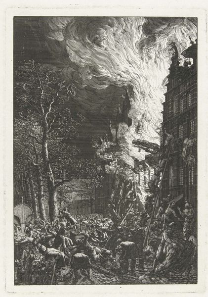 Reinier Vinkeles etched this image of the burning Amsterdam naval warehouse in 1791. The dramatic scene serves as a window into the political turmoil brewing in the Netherlands at the end of the 18th century. The fire, started by disgruntled sailors, symbolizes deeper tensions within Dutch society. Vinkeles, working in a time of political upheaval, captures not just the event, but the social unrest that fueled it. We see a crowd, a mix of horror and perhaps, for some, a sense of grim satisfaction. The inclusion of such details invites us to consider the broader political climate and the role of ordinary people in moments of crisis. To fully understand this etching, we need to delve into the archives, exploring contemporary accounts and political pamphlets. Only then can we appreciate how Vinkeles' image reflects and comments on the social structures of his time.