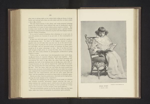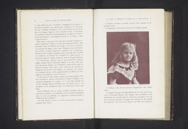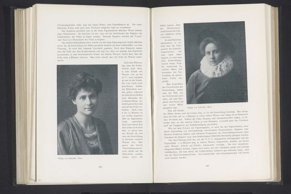 Editor: Here we have a photograph titled "Portret van een onbekende vrouw" – "Portrait of an Unknown Woman" – taken before 1903, by Philipp von Schoeller. It's reproduced as a print in a book. The delicate rendering of light is quite striking to me. What do you see in this portrait? Curator: The focus, unequivocally, rests upon the interplay of light and shadow which models the sitter's face and clothing. Note how the diffuse lighting flattens the planes, almost reducing the form to a series of tonal variations. This careful manipulation of light creates a certain mood, would you agree? Editor: Yes, it gives the image an ethereal, almost dreamlike quality. Is the blurring typical of modernism at this time? Curator: Consider the textural contrast achieved. The smoothness of her face plays against the almost wiry quality of the hair, creating visual interest. Observe, also, how the relatively simple composition--the figure centered, filling the frame--serves to heighten our focus on the pure pictorial qualities of the photographic surface. Don’t you think this directs attention to the materials and techniques themselves? Editor: I do. By de-emphasizing narrative, it focuses more on form and texture, drawing you in to the tactile qualities of the work. It's a balance between the subject and its technical presentation. Curator: Precisely. Schoeller manipulates the medium itself to become the message, allowing the viewer to consider the essence of the photograph beyond its subject. Editor: I now better appreciate the image as a modernist still life and portrait, a study of form and photographic processes of the time.