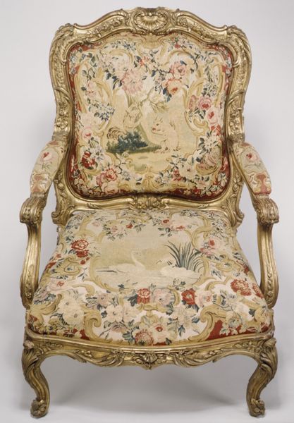 This tapestry-covered armchair features lush bouquets of flowers, tied with a ribbon. Floral motifs have long been associated with themes of love, fertility, and the ephemerality of life, deeply intertwined with our most profound emotions and rituals. The vibrant arrangements are reminiscent of vanitas paintings, where blooms symbolize beauty, albeit transient. The ribbon, a recurring emblem across epochs, initially denoted status and connection, seen in ancient Roman portraiture to Renaissance finery. Over time, ribbons evolved from mere adornments to potent signifiers of allegiance and affection. Here, the ribbon not only binds the bouquet but invites contemplation on the cyclical nature of life and the threads that connect us to history. This chair becomes more than furniture; it is an emotional tableau, echoing collective memories and inviting us to reflect on our own fleeting existence. These symbols recur, evolve, and resurface through time.