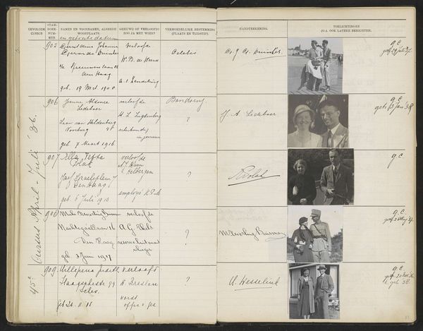 Editor: This is “Blad 66 uit Stamboek van de leerlingen der Koloniale School voor Meisjes en Vrouwen te 's-Gravenhage deel II (1930-1949),” potentially from 1935, by an anonymous artist. It's like an opened ledger featuring handwritten notes and small photographs pasted within each row. What initially strikes me is the formal nature juxtaposed with personal snapshots. What do you make of it? Curator: Indeed. Consider the book's purpose: a register of students at a Colonial School. Now, notice the pairing of bureaucratic record-keeping with personal photographs. This juxtaposition speaks volumes about identity and belonging, particularly within a colonial context. Editor: I see what you mean. It's like the official record tries to contain the individual experiences. What kind of emotional or cultural message do you think these symbols communicate? Curator: These aren't just records; they’re curated self-representations against the backdrop of colonial power. The act of including a photograph becomes an assertion of individuality within a system designed to classify and, in some ways, homogenize. Each photo offers a silent narrative, a visual echo of lived experience fighting for recognition. Consider the landscapes shown - the places of origin these students carry within. Editor: So it's about finding individual agency within institutional constraints. It makes me wonder about the stories behind each entry. Curator: Precisely. The handwritten notes reveal some facts, but the photos open up an interpretive space. They symbolize resilience, memory, and the enduring human need to leave a personal mark, even within the most rigid structures. Editor: That gives me a lot to think about. The students created little personal monuments within an administrative document. I will never see another registry the same. Curator: And hopefully, a deeper appreciation for how individuals subtly challenge prevailing systems through carefully chosen symbols of identity.