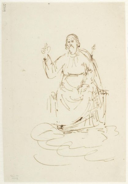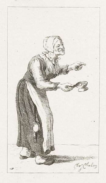This is an etching of a standing woman holding a fire test, made by Pieter de Mare in the late 18th century. The artist employed etching techniques to create delicate lines and shading on the plate, capturing the woman's likeness with precision. You can see how the lines are used to define the contours of her body and clothing, while subtle shading adds depth and dimension to the composition. The print captures a moment in time, depicting a woman engaged in a common ritual, highlighting the daily lives of ordinary people. This print preserves a snapshot of 18th-century life, where the process of etching becomes a medium for documenting social customs and individual character. Thinking about materials, process, and context encourages a deeper connection with art, inviting us to appreciate the skill and artistry involved in its creation, while challenging the traditional hierarchy between fine art and craft.