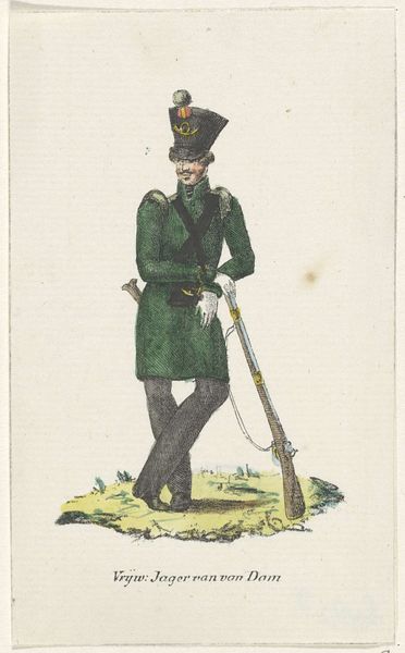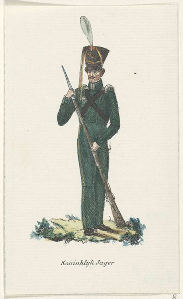 Willem Charles Magnenat created this print, "Noord-Hollandse Jager," using etching. The composition centers on a figure in uniform against a stark white background. The color palette is restrained, dominated by shades of green and hints of red, creating a muted yet structured visual field. The etcher’s marks are delicate, defining the contours of the figure and his attire with precision. The figure is grounded by a minimal base of vegetation, adding a touch of organic form that contrasts with the rigidity of the uniform. This structured approach reflects a broader cultural discourse, mirroring the era's emphasis on order and categorization. Note the way the etching doesn't just represent an image but also embodies a system of signs, contributing to a dialogue about identity and representation.