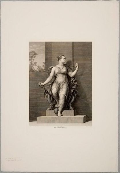 Editor: This is "La Fortuna" by Davide Testi, a black and white print depicting a winged woman riding a wheel. I'm struck by how the light seems to dance across her form, yet there's a sense of precariousness in the composition. What do you make of it? Curator: Ah, Fortuna! The fickle mistress of fate. Notice how Testi captures the inherent instability of her wheel. It's like life, isn't it? One moment you're soaring, the next you're tumbling. Does the crown in her hand suggest that even royalty isn't immune to fortune's whims? Editor: That makes me think of the phrase "wheel of fortune," always turning, for better or worse. Curator: Precisely! And doesn't that add a layer of… acceptance? Maybe even humor? After all, we're all just along for the ride. Editor: I see what you mean. It's a reminder that control is an illusion, and maybe that's not so bad.