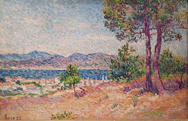 Theo van Rysselberghe made "Pines and Eucalyptus at Cavelieri" with oil on canvas, using a pointillist technique, where the process of dabbing paint becomes the subject itself. Look at how the texture of the paint creates this shimmering, vibrant surface! The blues and greens of the water are built up from tiny dots, giving it a breathing, almost living quality. Up close, you see individual marks, but stepping back, they blend into a cohesive, luminous whole. I love how this method kind of embodies the way we experience the world – little pieces coming together to form our overall impression. The way Van Rysselberghe handles the light here is fascinating too. It reminds me of Seurat, but with a warmer palette. It’s like he's not just painting a scene, but capturing a specific feeling, a mood. It's the kind of painting that invites you to linger, to get lost in the details, and to see the world in a new way.