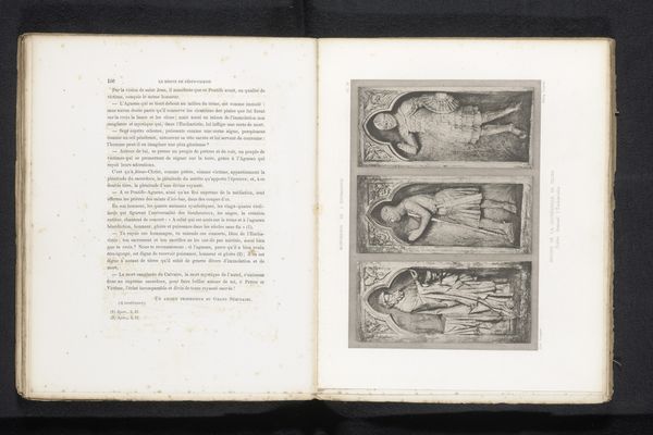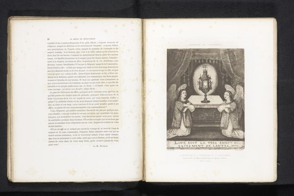 Editor: Here we have a photographic reproduction of a print depicting Raphael’s Sistine Madonna, dating from before 1861. It's presented as an open book, with the image on one side and German text on the other. The image itself feels quite serene, almost ethereal. What stands out to you when you look at this reproduction? Curator: The juxtaposition of image and text within this book format is really striking. It encourages us to consider not only the image itself but also its dissemination and reception. We must also account for the social and political context of image making in the 19th century. Reproductions like these were instrumental in popularizing and democratizing access to canonical artworks like Raphael's Madonna. Do you think this widespread availability changed its cultural meaning or impact? Editor: That's interesting, I hadn't thought about how access impacts the work. I suppose mass production could almost cheapen it in some way, by over-saturation? Curator: Exactly! It moved the image beyond the exclusive domain of the elite, potentially empowering the masses. But also consider how the interpretation may change as we move between original artwork and later versions/iterations, impacting the artwork's historical perception and influence on culture. What do you make of the German text alongside the image? Does it shape your understanding of its reception and meaning? Editor: I don't read German fluently, but I see it's a very dense text. Maybe it provided context or a theological interpretation of the Madonna? It adds another layer, connecting it to a specific cultural and intellectual framework. Curator: Precisely. This piece functions not just as an artwork but as a historical document, reflecting the complex interplay of art, religion, politics, and print culture in 19th-century Europe. The mass distribution is an undercurrent of democratization. Editor: That's given me a lot to think about. I initially saw a serene image, but now I see the complexities of its historical context and the shifting dynamics of art in society. Thanks. Curator: And thank you. Considering the role of art within culture is important. The conversation helps sharpen my own vision.