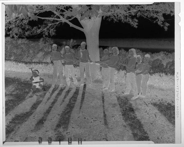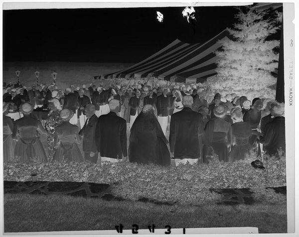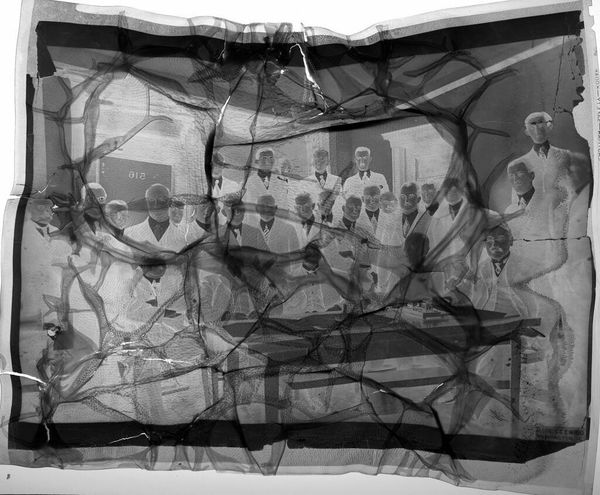 Curator: This intriguing image, "Untitled (large group portrait outside)," comes to us from the Hamblin Studio. Editor: My first impression is that it looks like a memory fading away—a ghostly gathering. Curator: Indeed. It presents a unique perspective on community, or perhaps institutional identity, wouldn't you say? Group portraits like these were often commissioned to project an image of collective strength and purpose. Editor: Yes, but there's something about the visible layering, the superimposition, that suggests fragmentation. Like, what if the strength is an illusion, if the picture is really many pictures? Curator: Perhaps it reflects the ephemeral nature of social structures themselves. The Hamblin Studio seems to be hinting at the precariousness of unity. Editor: Maybe it's about lost connections, or even the struggle to form them in the first place. A poignant meditation on belonging, I think.