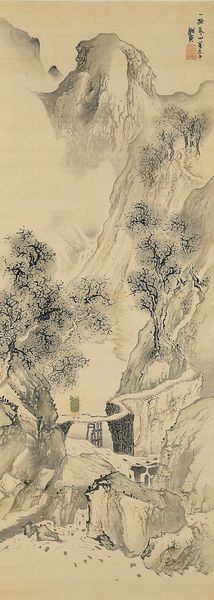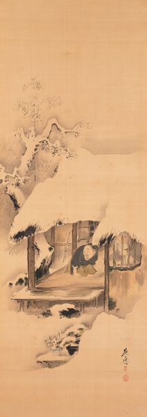 Curator: Standing before us is "Noh Play Hachinoki," a hanging scroll crafted with ink and color on silk, believed to be from the 19th century and attributed to Shibata Zeshin. Editor: It feels… isolated. Stark. The way the snow dominates the scene, pressing down on the small dwelling—the muted palette contributes to this feeling, creating an almost palpable sense of cold and hardship. Curator: Precisely. Zeshin, known for his lacquerwork, translates that mastery here. Observe the deliberate composition—the strategic placement of the bare branches against the snow-laden pines, the textural contrast achieved through the controlled washes of ink. There is such intentionality. Editor: And how interesting that he would use silk. We know the materiality of silk often reflects wealth and high status in Japan. In that regard, I must question how the artist considers this relationship of class between the depicted humble, almost derelict hut and its inhabitants, contrasted with such rich material choice for the work’s base. I wonder if Zeshin uses material tensions to highlight social imbalances or offer critique of contemporary society. Curator: Your point speaks volumes about Zeshin’s sophisticated technique. While narrative elements are at play, I remain drawn to the interplay of form and ground. How the snow itself almost dissolves into the background. It’s a fascinating exploration of figure-ground relationships. The calligraphic quality of the line, the spatial arrangement...these are integral to understanding its aesthetic impact. Editor: Still, thinking about folk-art traditions makes me wonder: to what degree does this aesthetic choice connect with labor involved? For example, the harvesting of silk is painstaking. How is such work seen or not seen within the piece itself? Does Zeshin risk overlooking the historical context with its choice of materiality? Curator: An excellent point to consider when observing Zeshin’s art. This piece becomes an aesthetic construction of cultural, historic and material tensions. Editor: Exactly. It leaves us thinking about the interconnectedness of production, consumption, and representation in 19th-century Japan.