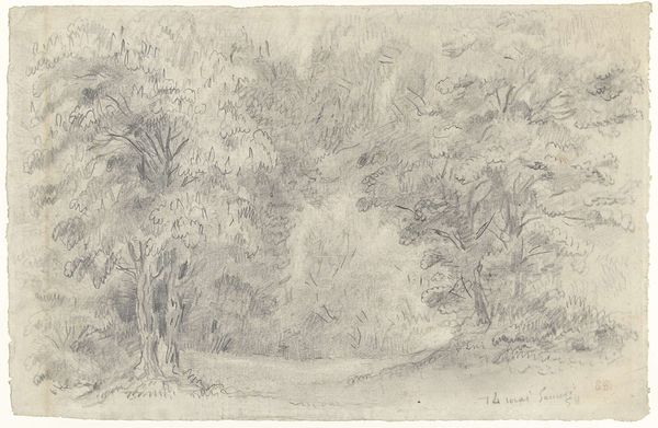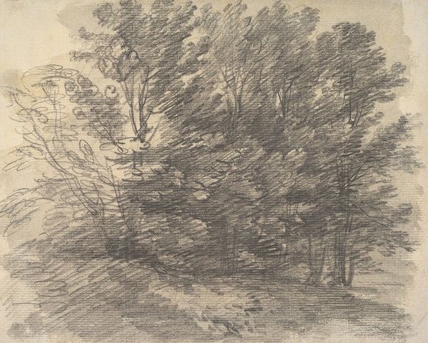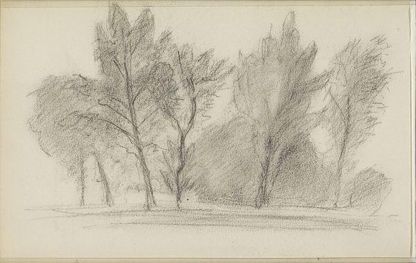 Curator: What strikes me immediately is the delicate interplay of light and shadow. There’s a stark, almost austere quality to it despite being a landscape. Editor: Indeed. Here we have "High Trees in a Flat Landscape", a graphite and pencil drawing by Willem Bastiaan Tholen, sometime between 1870 and 1931. It's currently held here at the Rijksmuseum. Curator: The density of the graphite is masterfully controlled. Look at how Tholen builds up the textures of the leaves and the rough bark. He captures a real sense of mass using just a few tonal variations. The impression created by these trees standing out is great. Editor: Landscape art in the Netherlands carried a significant weight of national identity. During this period, artists were often compelled to capture the quintessential Dutch landscape: flat, open, and dominated by the sky, to reflect their national consciousness. Tholen certainly contributes to that tradition. Curator: Absolutely. And there’s a clear structural clarity here, in terms of pictorial organization. The verticality of the trees bisects the horizontal plane, creating a harmonious balance. The composition suggests a study in form rather than an exercise in romantic sentimentality. Editor: It makes me consider the burgeoning conservationist movement at the time. The very act of portraying these towering trees might signify a growing appreciation—or perhaps a looming concern—for nature’s preservation in the face of urbanization. Curator: Interesting perspective. I see also the application of realism. The pencil-and-graphite strokes work in harmony. But this could be due to a number of different environmental and personal situations experienced by the artist during this period. It has to be considered in understanding and experiencing his work. Editor: Thank you. Thinking about Tholen’s era gives this work added depth. Now, every stroke feels imbued with purpose beyond mere representation. Curator: Agreed. Seeing the image through a social-historical lens truly opens up richer interpretation.
