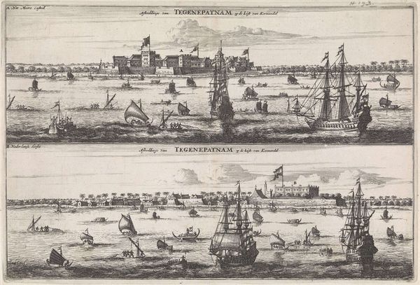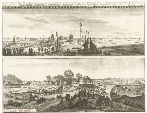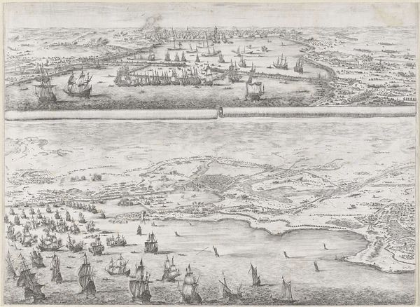 Editor: We're looking at "Gezicht op Kopenhagen, landzijde en zeezijde," or "View of Copenhagen, Land and Sea Side" by Frans Hogenberg, created in 1588. It's an engraving, a print. The composition is fascinating; it's almost like two separate images stacked on top of each other, showing the city from different vantage points. What do you see when you look at this piece? Curator: What strikes me is how Hogenberg is participating in the visual construction of Copenhagen as a center of power. Consider the date, 1588. This print isn’t just a record; it's a statement about Denmark's primary city. The upper register emphasizes the terrestrial access, depicting bustling activity inland, and the lower stresses naval strength and mercantile reach, visually linking the city to global trade routes. Editor: So, the print is actively shaping how people see Copenhagen? Curator: Precisely. Think about who this image was for. Probably circulated amongst elites, merchants, those invested in the city's success. By showcasing both land and sea power, Hogenberg promotes Copenhagen as a strategically important and commercially viable urban center. How do you see the style contributing to this purpose? Editor: It feels very… objective, almost architectural in its precision. It's not trying to be romantic; it's communicating information. Curator: Exactly. And that "objectivity," that visual clarity, lends it authority. This isn’t just a pretty picture; it’s a political tool, solidifying Copenhagen's image in the European imagination. Look at the text, prominently displayed. That also reinforces the intention of promoting the city and imbuing it with importance. Editor: I see it now. It's like visual propaganda almost! It is no longer just about representing something. Curator: Indeed. The power of images lies not just in what they depict but also in what they *do*. Prints like these shaped early modern geopolitics as much as treaties and trade agreements did. Editor: That's a great insight. I will never look at a cityscape print the same way again!