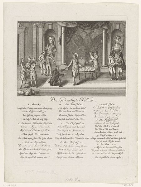 Curator: This intricate engraving is a satirical print regarding the Treaty of Fontainebleau, dating from 1785 to 1786. It resides here at the Rijksmuseum, unsigned. I find the level of detail so striking. Editor: Immediately, I'm struck by how much it packs in. We have figures inside and outside a tent, text panels crammed everywhere...It looks like propaganda, and I'd bet the material production here speaks to quick reproduction and dissemination, perhaps meant for a specific audience? Curator: That's spot on! The print functions as a sharp political commentary. It lays bare the shifting alliances and self-serving motives of various European powers, and yes, certainly aiming at a specific well-informed audience. The way it employs symbolism is just masterful – these aren't just portraits but embodied representations of greed and betrayal. Editor: Well, let's not ignore the craftsmanship. Look closely and you'll appreciate the work required to render such crisp lines and the textual arrangement on the copperplate—labor we now easily take for granted! What was the intention with these layers of symbolism do you think, from a materials point? Was it didactic or for posterity? Curator: A bit of both, I suspect. There's definitely an intention to inform, to persuade, perhaps even to incite, but it also serves as a snapshot of a very specific historical moment. It speaks volumes about power, about diplomacy, and about the complicated relationships between nations, but, in the end, as satire. Editor: Yes, it is like the material itself, pressing a narrative into the viewer. The print itself, existing perhaps as single sheets and circulated and discussed within a specific segment of society. It emphasizes for me how meaning arises not solely from the images themselves, but from their journeys within the networks of commerce, sociopolitical discourse and making practices. Curator: Absolutely. Considering it within the networks of knowledge brings new depth, no? For me, the fact it can elicit this much conversation centuries after its creation, highlights something inherently potent about visual satire and those who make it! Editor: Agreed. It serves as a potent reminder that artistic mediums not only convey content, but embed within it—labor, intention, and the social contexts of the making!