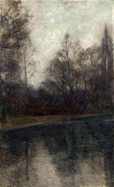 Curator: Ah, yes. Here we have Franz von Stuck's "Landscape," painted around 1890. Look closely at the application of oil paint, so characteristic of his approach during this period. Editor: Dreary, isn’t it? Oppressive, even. I mean, technically, it’s well done, but that murky water…it’s not exactly inviting. I almost feel a chill. Curator: Don’t you think that subdued palette serves a purpose? Consider the Symbolist movement, so relevant during the late 19th century. This wasn’t simply about depicting nature as it is, but about conveying deeper, often melancholic, truths. The greys and browns suggest a psychological landscape as much as a physical one. Think of the fin de siècle anxieties lurking beneath the surface! Editor: Well, if we’re talking anxieties, those dark trees bordering the murky pool of water could represent repression. They strike me almost as imposing guardians, you know, reflecting power structures, maybe patriarchal forces at play... It reminds me a lot of how landscapes during that period rarely just portrayed beautiful scenery, but reinforced established societal frameworks and moral beliefs. Curator: That’s fascinating! I see the guardians. But in von Stuck’s hands, I find it compelling because it transcends didactic messaging, it feels intuitively symbolic, if that makes sense. This hazy realm evokes the subjective space where personal myths and truths intertwine, creating ambiguity, mystery and prompting profound individual introspection. Editor: Introspection and individual, well... von Stuck, as a painter, he himself participated in very specific art historical narratives that weren't available to his women contemporaries, and perhaps we could use that reflection time to bring awareness about our own participation as viewers in those same unequal narratives, by centering art by marginalized voices. Curator: That's such a valuable reframing to keep in mind and something that this landscape certainly evokes in my thinking. Art's not made in a vacuum, is it? I can continue imagining those oppressive silhouettes on the other side of the shore, their implications for centuries, thanks to your interpretation! Editor: Absolutely! It just underlines how art isn't merely about what’s represented, but *who* gets to do the representing, and to what end! Thanks, Franz!