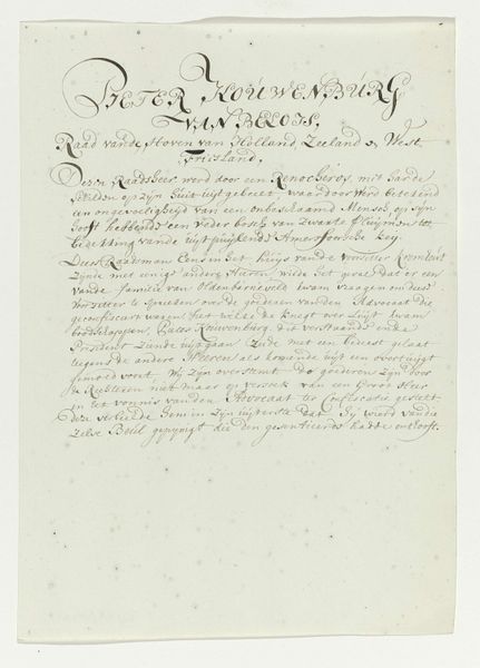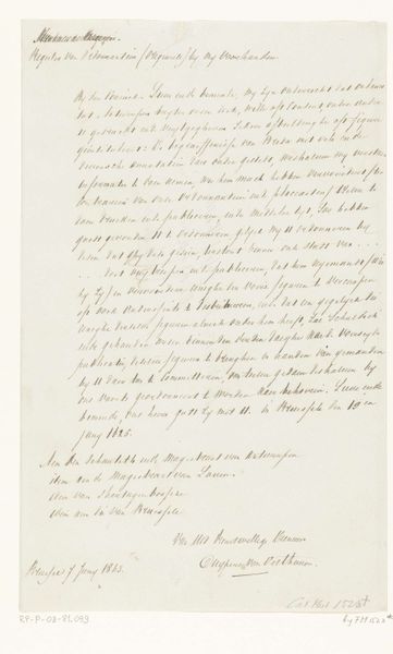 Editor: This intriguing drawing from possibly 1816, by A. Bachman, features delicate ink calligraphy on paper. It feels like a formal document, perhaps a historical record. What stands out to you about this piece? Curator: This drawing immediately strikes me as a powerful artifact connecting individual lives to the vast machinery of state. It seems to be a translated marriage certificate, possibly a copy, detailing the union of Prince Willem II of the Netherlands and Anna Pavlovna of Russia. It prompts us to consider the intersection of personal relationships and political power. What do you notice about the individuals named in the document? Editor: I see several names, and mentions of imperial majesties, so there’s a strong sense of the aristocratic class at play. The drawing looks like the text could tell the stories of cross-cultural marriages and alliance-making through familial connections. Curator: Precisely! These marriages were not just romantic unions; they were strategic alliances. And considering the era—following the Napoleonic Wars—these alliances were crucial for re-establishing European power dynamics. Notice the calligraphic style itself, the meticulous rendering. Does that detail speak to you in any way? Editor: The ornate writing emphasizes the importance and authority, and highlights its status as a valuable historical object. Curator: Exactly. The act of translation is a cultural transaction; handwriting represents an attempt to capture these agreements. Consider the voices present and absent here. Whose perspectives are prioritized, and whose are omitted? Editor: I never considered how documents like these are stories in themselves. Thank you. Curator: And thank you, thinking about those unseen people really highlights the intersectional narratives contained within this piece.