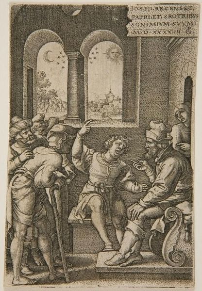 Curator: Georg Pencz created this small engraving, "Death of Lucretia," sometime in the first half of the 16th century. It's currently located here at the Harvard Art Museums. Editor: Well, right away, the drama just leaps out, doesn't it? All that swirling energy focused on one point: Lucretia, collapsed on the floor. It feels like a scene from a play. Curator: Indeed. Pencz captures a pivotal moment in Roman history and legend. Lucretia, having been dishonored, takes her own life, sparking a revolt that ends the Roman monarchy. Editor: It's amazing how much emotion he packs into such a tiny space. The grief, the anger... you can almost feel the weight of history pressing down. That discarded dagger says so much. Curator: The dagger, a symbol of lost honor, certainly carries significant weight. And consider the figures surrounding her: witnesses to her tragedy, soon to be agents of change. Editor: It really does make you think about the power of symbols, even in a work this small. Curator: Absolutely. Editor: This really stuck with me; you realize just how long we’ve been dealing with these kinds of conflicts.