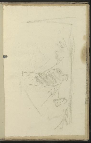Curator: This sketch by Willem Witsen, "Vrouw in klederdracht, mogelijk zittend op een akker", or "Woman in traditional dress, possibly sitting in a field", created between 1893 and 1897, gives us such an intimate glimpse into Dutch rural life. Editor: Intimate, certainly. It feels like a stolen moment, rendered hastily with just a pencil on paper. I am most aware of the sparse quality and the immediacy in the lines. Curator: Witsen has captured the essence of this woman, her connection to the land emphasized by the minimal surrounding elements, the implication of a field rather than a detailed landscape. Think about the traditional garments and what those might tell us about community and shared identity in this context. Editor: And how those garments were made. Who spun the wool, wove the fabric, dyed the threads? These clothes are labor, stories of material processes connecting her to a network of makers. You can almost feel the weight of the cloth in the heavier shading around her waist. Curator: Indeed, clothing as cultural memory! It also serves as a signal to the viewer, linking the subject with enduring representations of women as keepers of traditions. The lack of fine detail lends an archetypal feel to the portrait, like a representation of “woman” more than an individual likeness. Editor: Perhaps. Or maybe the simplicity underscores the woman's agency? By stripping away the details, Witsen places the emphasis on the figure's posture, her very grounded presence in the landscape. It's in her posture, the way her form has been simplified, and it allows her form to meld almost naturally within the field, hinting at the long arduous work the garments must endure, rather than being decorative. Curator: A poignant contrast. I had seen an expression of timeless womanhood in her attire. Now, considering its creation and material history as you suggest, I see her attire in relation to her daily environment in this open, shared field. Editor: I am drawn back to how the making practices are central to her, reflecting the values that go unnoticed in our era of automated manufacturing and fashion. It shows just how far removed we are from seeing the human hands which cultivate what we ourselves now put on every single day.