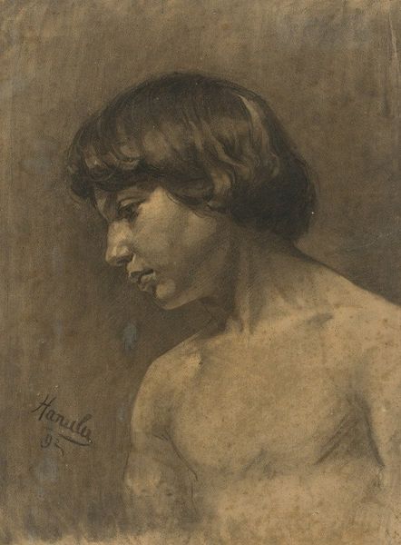 Charles William Mitchell created this "Study of a Head" using oil on canvas. The painting is a study of a male head in profile, dominated by a palette of earth tones. Mitchell’s use of light and shadow creates a dramatic chiaroscuro effect. Notice how the artist uses visible brushstrokes to model the form, giving the face a sense of texture and depth. The background is muted, which keeps our focus firmly on the subject’s face. Mitchell’s composition is carefully structured. The profile view allows Mitchell to explore the contours of the face, emphasizing the lines of the nose, mouth, and jawline. The turn of the head gives the piece an implied dynamism, as if the subject is caught in a moment of thought or contemplation. This creates a sense of psychological depth, going beyond a mere physical depiction. The visible brushstrokes are not just about describing form; they are about conveying a sense of vitality and the artist’s own process.