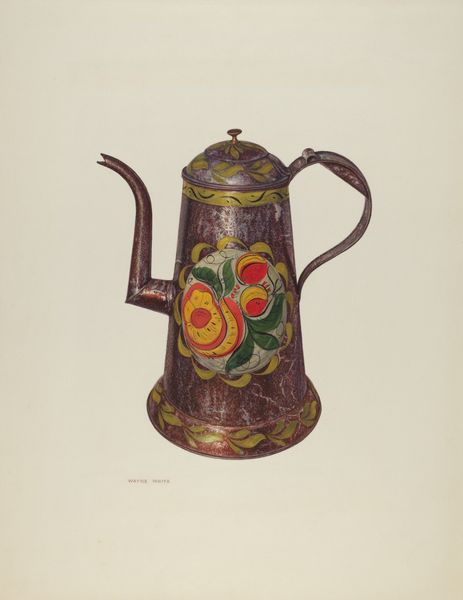 Editor: Here we have Charles Henning's "Toleware Coffee Pot," likely created sometime between 1935 and 1942. It seems to be a watercolor or possibly an oil pastel drawing of, well, a decorative coffee pot! I'm struck by how this everyday object is elevated with intricate designs of fruits and foliage. What jumps out at you when you look at this piece? Curator: The vibrant ornamentation speaks volumes. Toleware, itself, represents a cultural narrative. Everyday objects, elevated through art, served not only a functional purpose, but became carriers of symbolic weight. The motifs - fruits and foliage - often represented abundance, fertility, and connection to nature, beliefs deeply embedded in community memory. Notice how these designs repeat in the visual arts, crafts, and even architecture across periods, serving as a link between generations? Editor: That's fascinating! So, this isn't just a pretty coffee pot; it's also communicating deeper meanings about home and plenty? Curator: Precisely. Think about the ritual of coffee, often shared amongst friends and family. The painted motifs reinforce this sense of communal warmth. How does the artist draw you in through the repetitive motifs? Is there some feeling or longing stirred? Editor: I suppose it does evoke a sense of nostalgia. It feels very domestic, maybe something I’d find in my grandmother's kitchen. The colors, while muted, are warm and inviting. I can almost smell the coffee! Curator: That's it! These objects often operate on a sensory level, accessing deeply embedded cultural memories. It speaks to our collective desire for connection and comfort, made visual through common imagery. Editor: I never thought about a coffee pot carrying so much history! It definitely makes me appreciate everyday objects, and their symbolic potential, in a whole new light. Thanks! Curator: My pleasure! Keep looking, and you'll find symbols everywhere!