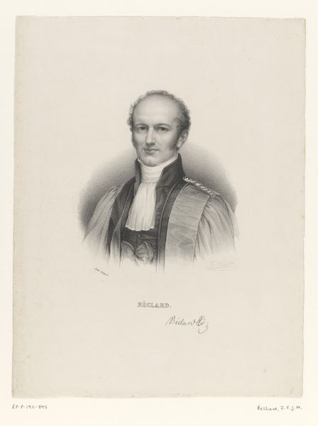 Editor: This is a print from before 1861 by Auguste Bry, titled "Portret van Louis-Jacques-Maurice de Bonald, aartsbisschop van Lyon," using intaglio and engraving techniques. The detail is remarkable. The image almost seems to fade into the page. What can you tell me about its construction? Curator: Notice how the artist employed line and tone. The intricate network of lines establishes volume and form, with the darker areas defining the contours and receding planes. It’s a study in contrasts: observe the stark white of the page offset by the varying degrees of gray. Are you sensing a hierarchy of form within this framework? Editor: I think so. The face is more sharply defined, drawing my eye. And there's a certain flatness in the robe and background that almost pushes the face forward. Is this contrast intentional, creating a focal point? Curator: Precisely. The density of the lines directs our gaze. And let’s consider the compositional balance: the figure is centered, but the gaze is slightly averted, lending dynamism. Do you observe how the light catches the planes of his face and vestments? How do you feel that informs the meaning of the work? Editor: The light seems to emphasize the archibishop's stoicism. And how it shapes his collar. Thank you! Curator: A fascinating analysis of form revealing content! The interplay between technique and subject provides great insight into the artwork’s inherent qualities.
