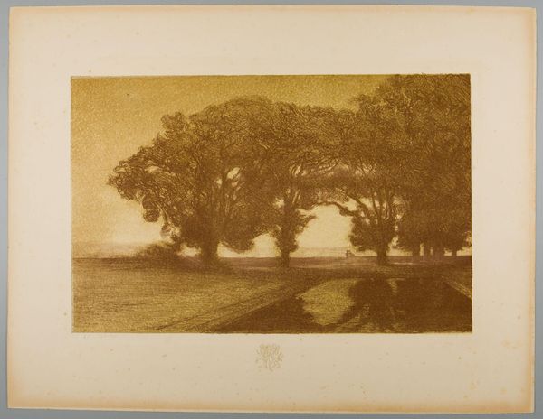 Editor: Here we have Charles-Marie Dulac's "Landscape, Remarque: Poppies." It's a lithograph, and evokes this hazy, dreamlike impression. What strikes you most about the composition? Curator: The tonal arrangement commands immediate attention. Note how Dulac orchestrates subtle gradations of light and shadow. The almost monochromatic palette, combined with the textured application of the lithographic crayon, unifies the pictorial space. How does this affect your reading? Editor: I feel a sense of stillness. The lack of contrasting color keeps my eye moving across the whole surface. Curator: Precisely. This absence of stark contrasts, coupled with the density of line work in the trees, and a clear ground, directs our gaze. It is a compelling example of how formal elements can generate a particular aesthetic experience. Editor: I hadn't considered how that balance created a sense of depth and tranquility. Thanks!