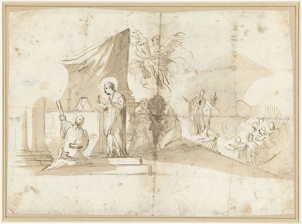 Curator: This is Ferdinand Ruscheweyh's "Title Page," located here at the Harvard Art Museums. It's a complex drawing. Editor: Yes, it's rather delicate, isn't it? The pencil work gives it an airy, almost ephemeral quality. Curator: The drawing was made as the frontispiece for a book illustrating Goethe’s Faust. It reflects the revival of German art following the Napoleonic era. Editor: You can really see that in the symmetrical arrangement of allegorical figures at the top and more grounded scenes below. Curator: The use of classical imagery, alongside scenes of everyday life, reflects a nation grappling with its identity in a rapidly changing world. Editor: Absolutely. I see a clear dialogue between the divine and the mundane, expertly balanced. Curator: It's a fascinating look at how social and intellectual currents influenced artistic expression. Editor: Indeed, this piece invites us to examine both its formal structure and its historical context.