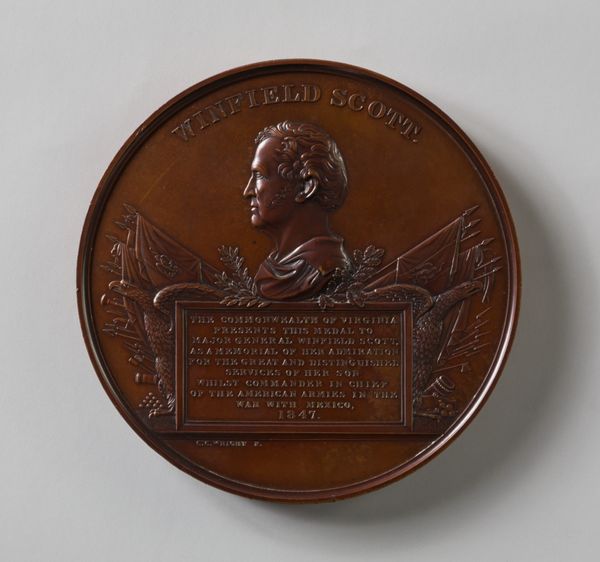 Editor: This is the "Medal of General Winfield Scott," a bronze relief created in 1848 by Charles Cushing Wright, residing here at the Met. The color is quite lovely, that deep, burnished brown…it’s quite formal, isn’t it? Almost severe. What jumps out at you when you look at it? Curator: Oh, Winfield, my Winfield! What strikes me is the absolute...seriousness of it all. Look at that profile, the determination etched into his face, even immortalized in bronze. But doesn't it also feel like a bit of historical theatre? All that gravitas for a medal commemorating a Resolution of Congress! Editor: Historical theatre! I like that. Is it meant to feel… propagandistic? Curator: Perhaps "celebratory propaganda" is a better term? Think of it: a nation flexing its nascent power, enshrining its heroes. The circular form itself lends an air of completeness, of a story sealed and delivered. The stars – counting them all must have taken ages – symbolize aspirations… unbound potential. What stories do *you* imagine swirling behind his gaze? Editor: I suppose he's envisioning future victories... but he kind of looks like he’s trying to remember where he parked his horse. That little upward tilt to his chin makes me want to know if he approved of this! It looks quite permanent to have a potential bad day turned into something of bronze... Curator: You are incorrigible. Perhaps it was hubris or maybe that he simply enjoyed striking a pose. But beyond the medal itself is the *idea* of the hero… larger than life, pressed into history, bronze and all. Next time, perhaps you should ask the bronze. Editor: Right? “Hey bronze, what's the real story? Spill the (molten) tea." This has actually been really fun and gives a much better sense of that medal's meaning in society at the time.