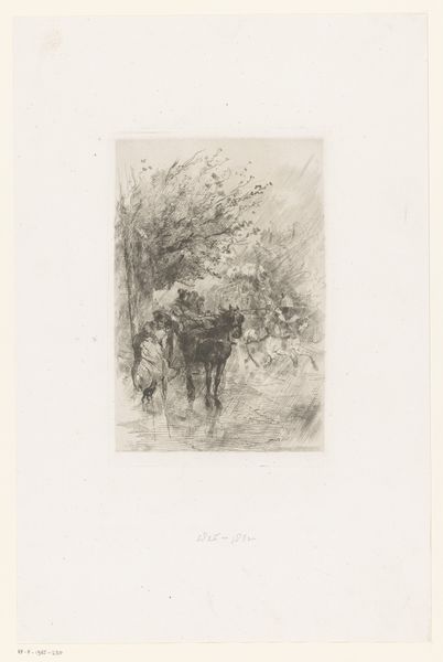 Curator: This sketch, titled "Ploegen," attributed to Pieter de Josselin de Jong and dated sometime between 1871 and 1906, offers a glimpse into rural life. It’s rendered in pencil, a medium lending itself to both precision and expressiveness. Editor: The strong contrast immediately strikes me—that dark, furrowed earth against the almost ethereal sky. It’s simple but powerfully evokes a sense of laborious work. Curator: Precisely. We see here the very means of agricultural production depicted: a farmer and his horse engaged in plowing. The pencil allows for intricate detailing of the horse's musculature and the texture of the soil, emphasizing the physical labor involved. Editor: Note how the composition directs the eye, tracing the path of the plow. The strong diagonal gives it an incredible depth for such a small-scale drawing. The lines of the furrow pull your gaze into the background. Curator: The context here is important. Realism was a dominant movement during this period, focusing on portraying everyday life without idealization. This drawing presents farm labor unsentimentally, depicting it almost clinically. Editor: But even within that realist approach, look at how de Jong uses light and shadow! See how the illumination suggests the time of day and how the shadows cast by the horse give volume. I find it really enriches the overall mood, providing a visual language for this depiction of farm life. Curator: Consider too, the accessibility of pencil as a medium. It made art production more democratic, available even to artists documenting working-class life. The drawing's lack of overt stylization reinforces the notion of presenting work as is. Editor: I see your point about accessibility, yet, technically, consider the artist's mark-making. It’s controlled and suggestive rather than overtly descriptive; each pencil stroke has its own precision in creating tone and texture. The composition balances reality with subtle artistic interpretation. Curator: It ultimately reveals art as intertwined with societal dynamics. This isn’t just a pretty picture. This represents labor, class, and the depiction of ordinary life during a transformational period in Dutch history. Editor: Agreed! De Jong uses form, line and tonal gradation to create an emotive landscape and shows, within apparent simplicity, remarkable expressive force. Curator: A perfect illustration of the intersection of artistic form and social practice. Editor: An observation well met; both contribute to our comprehension of this pastoral composition.