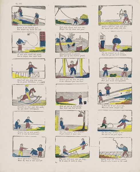 This print, titled "Het kinderspel, behaagt ons wel", which translates to "Children's games, please us well," was created by Lutkie & Cranenburg. It's an intriguing example of how images, even those seemingly lighthearted, are products of their time. The printmaking process itself – likely etching or engraving, given the fine lines – speaks to a pre-industrial mode of image production. Each print would have required skilled labor, from the initial design to the careful transfer onto paper. The hand-coloring adds another layer of craft, albeit a potentially more repetitive task. Looking at the scenes depicted, we see children engaged in various forms of play. The presence of these images suggests a growing awareness of childhood as a distinct phase of life, yet the very act of printing and distributing such an image points towards a burgeoning market economy, where leisure and entertainment are commodified. So, while the image celebrates the innocence of play, it's also embedded in the social and economic realities of its time, reminding us that even the simplest image carries complex meanings related to labor, production, and consumption.