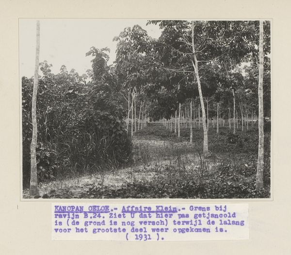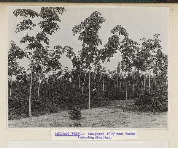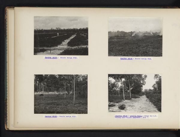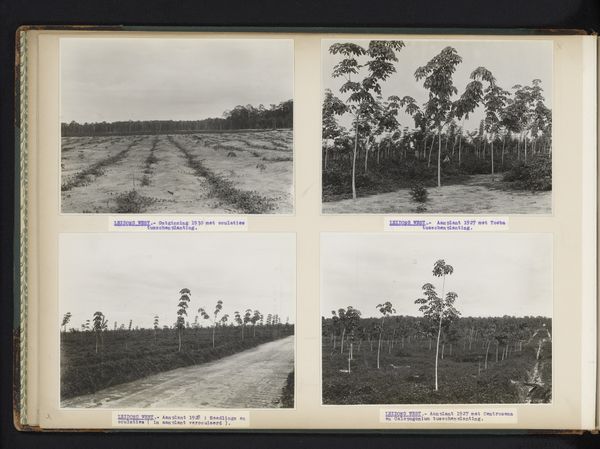 Curator: Immediately I get this almost wistful feeling from it. The grainy black and white gives it a strong sense of nostalgia, and even isolation, wouldn't you say? Editor: I do. It is striking. The pictorialist style and the subject matter itself—"Rubberbomen op Kanopan Oeloe, 1933", that is, rubber trees in Kanopan Oeloe as seen through the lens of an anonymous photographer in 1933—invokes a strong sense of place and a specific moment in time. Curator: Exactly! But look closer, do you feel a contrast? This 'sense of place' almost feels imposed, curated? Perhaps even fabricated? Because it seems to idealize or 'soften' an industrial landscape. Editor: Ah, that's interesting. Rubber plantations represent both colonial enterprise and, certainly, exploited landscapes. Symbolically, they speak to a history of resource extraction and labor. Curator: That visual ‘softening’ almost normalizes something, when in reality it shouldn't be! Even in the arrangement. These are organized uniformly on a blank page, like a scientist's notebook. How very disconnected and clinical, wouldn’t you say? Editor: I'm glad you brought up its form. It invites meditation on visual categorization itself: the archive, memory, knowledge-making through photographic representation. But there's also the recurring symbol of the trees themselves... they are sentinels, silent witnesses of historical transformation. Curator: Yes, and perhaps silent accomplices too, I hate to say. Knowing the period and industry here makes my emotional landscape heavy. Almost like…mourning? Editor: Absolutely. Perhaps in confronting landscapes marked by difficult history, it’s important for our memory not to rest too easy, and remember the land also holds echoes of human toil. Curator: Beautifully said, and the older I get, the more important those echoes feel. Thank you for illuminating it further!