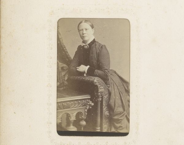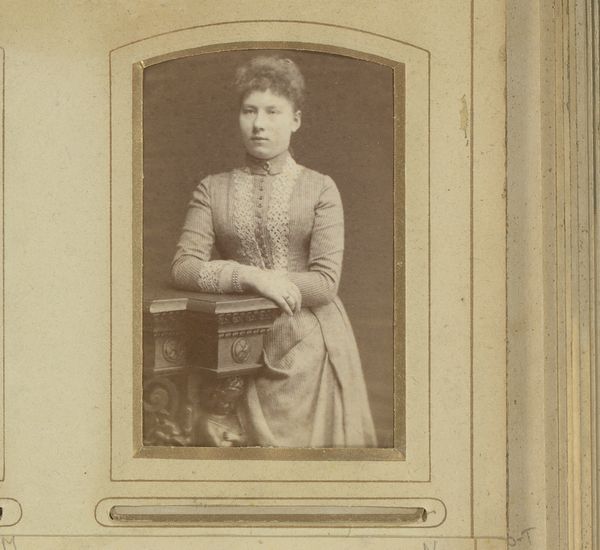 Ernst Schroeter created this photograph, "Portret van een meisje, leunend op een meubel," using early photographic techniques. The sepia tones and the subject's formal pose evoke a sense of stillness and introspection. The composition is carefully arranged; the girl's figure is framed within an arched border, emphasizing her as the central focus. Her gentle lean against the furniture introduces a diagonal line that softens the formality, adding a dynamic element to the otherwise static portrait. Light and shadow play across her face and clothing, creating subtle gradations that model her form and highlight the details of her attire. The materiality of this early photograph speaks to a moment in history where image-making was both a science and an art. Its aesthetic is rooted in the desire to capture and preserve a moment, reflecting the cultural values placed on memory and representation. The photograph’s enduring quality invites us to consider the passage of time and the evolving nature of portraiture.