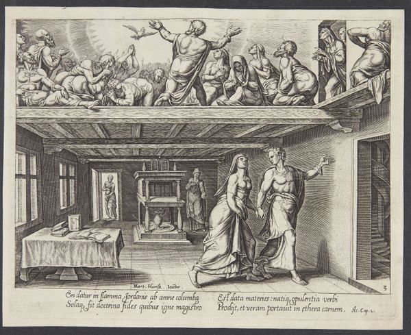 Curator: Let's consider this print, "Uitstorting van de heilige Geest" from around 1643-1646, housed in the Rijksmuseum. It's an engraving. Editor: It's striking how the scene is divided horizontally, the upper area showing what I believe to be the Holy Spirit descending upon figures above, and a rather domestic scene below. What particularly draws your attention? Curator: The interesting division foregrounds two distinct spaces: one divine, and the other seemingly human, even bourgeois. What intrigues me is thinking about how such a print functioned within its period. Was it consumed as religious art or as a sort of didactic material? Was there an effort to control this production in terms of message? How was labor involved? Editor: I see your point. How does its materiality – as an engraving – play into its message or distribution? Curator: The relatively reproducible nature of printmaking is essential. It facilitates broader distribution, and democratizes access to religious imagery but consider its quality and longevity. Did people value or undervalue a print over painting? It suggests something about Baroque society's consumption of spirituality and images, the function of art as an industry. And of course, engravings imply labor -- someone is physically etching this. Do you notice that interplay between sacred subject matter and this mundane aspect? Editor: Absolutely. The skill needed for the detailed etching clashes intriguingly with the spiritual theme, blurring the lines between craft and high art, and prompting a question about the intended audience and their understanding of both the subject and the production involved. Thanks, I hadn't thought of it that way. Curator: Exactly. Considering production helps reveal art's cultural work!