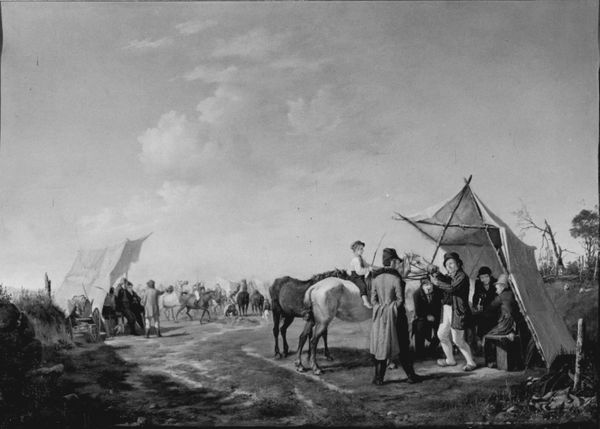 F.C. van Bracht created this drawing of riders by two tents in a hilly landscape at an unknown date using pen and grey ink and grey wash on paper. The composition is structured around two tents set against a backdrop of rolling hills and a distant architectural structure. The visual elements evoke a sense of transient life. Note how the tents, rendered with soft, flowing lines, contrast with the more defined, angular figures of the riders and the landscape. This interplay of textures and forms creates a dynamic tension, suggesting a world in flux. The monochromatic palette, dominated by shades of grey, reinforces the sense of transience and perhaps even uncertainty. Consider how the composition directs our gaze—from the detailed foreground figures to the hazy, less defined background. This technique not only establishes spatial depth but also hints at the limits of perception and knowledge. Is van Bracht suggesting that what we see is always mediated, incomplete?
