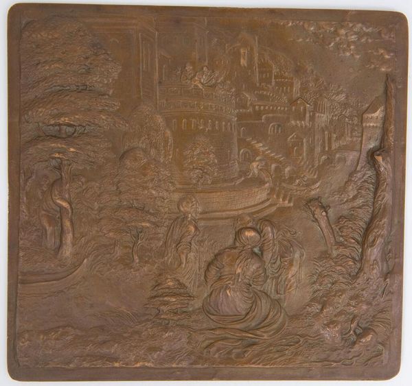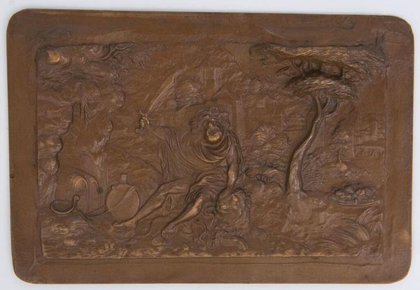 Editor: This small bronze relief, "The Envious Man," comes from the series "Bacchus and the Consequences of Drunkenness" by an anonymous artist. It's incredibly detailed, but the mood seems… agitated? What strikes you when you look at this piece? Curator: Ah, agitation is a good word. I see a figure consumed by rage, literally smashing a wine vessel, surrounded by symbols of both abundance and ruin. It’s like a tiny, potent drama unfolding before us. Can you feel the raw emotion etched into the bronze? Do you wonder what triggered such a violent display? Editor: Absolutely. It's like a snapshot of a breakdown. I hadn't considered the symbols of abundance versus ruin before. Curator: These images were like little morality plays back then; reminders that even pleasure has its dark side. Now, I'm wondering, does it still feel relevant today? Editor: Definitely. It's a timeless warning about the dangers of unchecked emotion. Thanks, that perspective really opened it up for me.