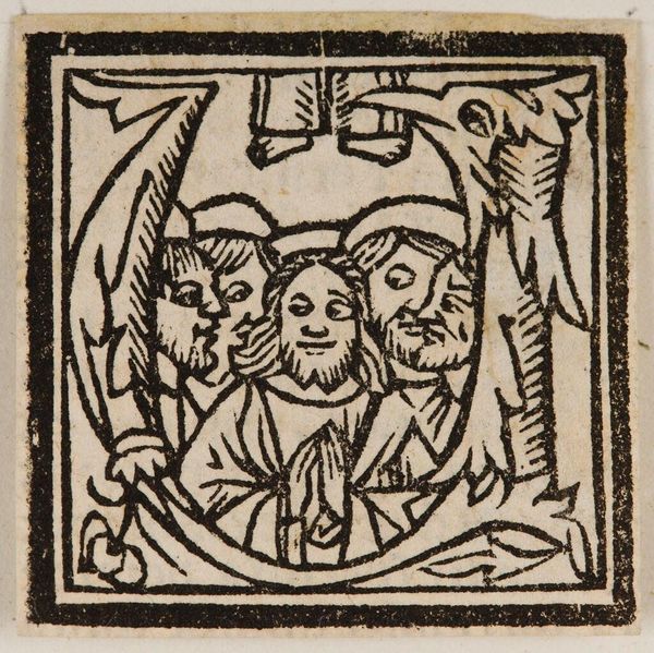 Curator: This woodcut, known as Letter I, resides in the Harvard Art Museums. It's anonymous, but let's delve into its symbolic world. Editor: The dense, intricate linework is striking. The composition feels incredibly full, almost bursting at the seams of that initial "I". Curator: Indeed. The image is bisected by the letter, with Jesus, surrounded by apostles, on the left, and Mary, the Virgin, holding the Christ Child, on the right. This division suggests the duality of earthly and divine realms. Editor: I see that, and the stark contrast created by the dense hatching really emphasizes the weightiness of the subject matter. Curator: The chalice held by Jesus hints at the Eucharist, while Mary symbolizes purity and maternal love. These images trigger strong memories and cultural meanings. Editor: It’s fascinating how such a simple form – a letter – can contain such a wealth of narrative and emotion, beautifully rendered through the artist's careful control of line and form. Curator: Absolutely. The image embodies the enduring power of visual symbols to convey complex spiritual ideas. Editor: It leaves me contemplating how much a single image can reveal when we truly look.