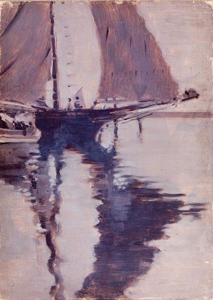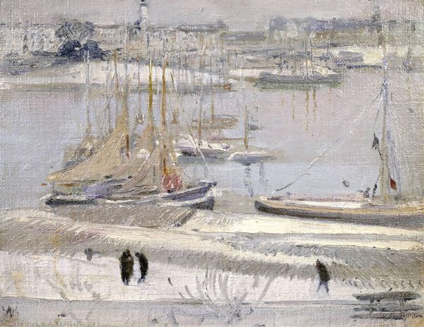 'Royan' is an oil painting by Samuel Peploe, whose date remains unconfirmed. The canvas, dominated by muted tones, creates a serene yet subtly unsettling visual experience. The loose brushstrokes build up the composition to evoke a sense of place without explicit detail. Peploe's structural approach is fascinating. The composition divides the scene into distinct horizontal bands of sky, land, and water, destabilizing conventional notions of depth. Patches of color—the ochre of the boats, the green of the distant land— punctuate the otherwise grey and white palette. These semiotic elements, functioning almost as signs, invite us to interpret the scene not as a literal representation, but as a constructed visual space. Note how the artist uses the materiality of paint itself, building texture to disrupt the visual field. This invites a dialogue between the tangible and the representational, typical of the Modernist exploration. The aesthetic value is intrinsically tied to intellectual and cultural questions about perception and representation.