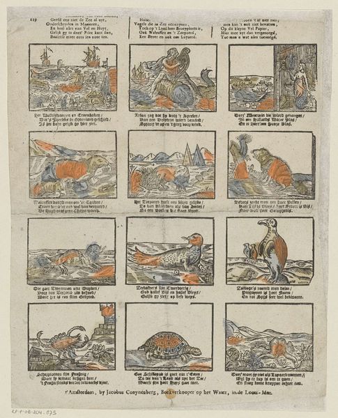 This print, "Zinnebeelden uit de fabelen van de Lafontaine," was created by Glenisson & Zonen. Its surface is divided into a grid of twenty-four scenes. The limited color palette of yellow, green, and brown, combined with the tight composition of each scene, creates a dense and visually engaging experience. The organization into a grid lends itself to structuralist analysis. Each square operates as a sign, a self-contained unit of meaning, while its position within the grid influences its interpretation. The scenes, pulled from La Fontaine’s fables, draw on a shared cultural knowledge, a semiotic system where animals and humans enact moral lessons. Each tableau uses simplified forms and compositions to present these lessons. The grid, with its repetitive structure, mirrors the repetitive nature of moral instruction itself. It suggests that, despite variations in content, the underlying structures of morality and storytelling remain constant. The print's overall effect is one of order and didactic clarity, using form to reinforce the fables' teachings. This work prompts us to consider how visual structures contribute to the transmission and reinforcement of cultural values.