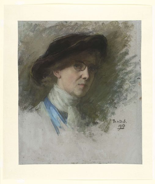 Here is a pastel drawing made by Thérèse Schwartze, entitled Self-Portrait. The portrait presents a formal study in muted tones contrasted with the striking blue of the hat. Soft greys and blacks define the sitter's features and clothing, evoking a sense of quiet introspection. The textural strokes of the pastel create a tactile quality, suggesting both substance and transience. Consider the structural composition: the artist deliberately positions herself within a frame that is both intimate and reserved. The direct gaze confronts the viewer, challenging traditional notions of portraiture as mere representation. The hat, an extravagant form, challenges the eye to consider how adornment and identity intersect, particularly for women artists of this era. This self-portrait serves not just as an image, but as a statement about the artist's place within the cultural and artistic discourse of her time, inviting ongoing dialogue and fresh perspectives.