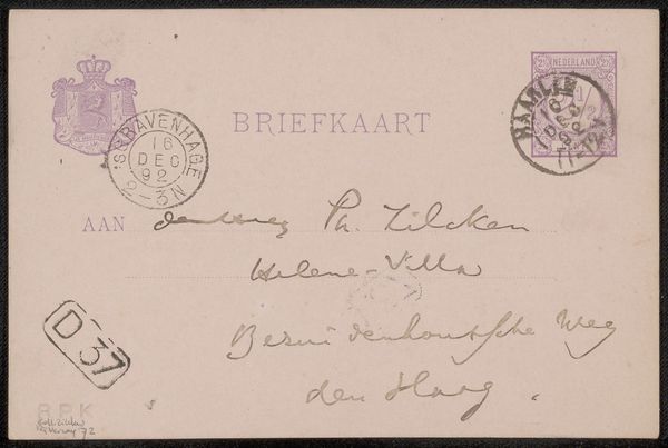 Editor: So, here we have a piece titled "Briefkaart aan Philip Zilcken," dating from before 1893. It's essentially a postcard, rendered in ink on paper. I find the script rather delicate, almost ghostly. What’s your take? Curator: It's fascinating how such an everyday object can offer glimpses into the social networks and cultural milieu of the time. Who was Philip Zilcken and what role did he play in the art world? That would contextualize the significance of the card and Verwey's connection to him. Editor: Good question! Let’s assume for a second that Zilcken was a relatively important critic at the time. Curator: Then this “Briefkaart”, with its seemingly simple message, becomes a document in a subtle negotiation. Consider how correspondence itself functioned – the cost of postage, the time it took, the implicit hierarchy established between sender and recipient. Even the design elements - the stamps, the official imprints - communicate ideas about nation, administration, and power. Editor: That's a side of it I wouldn't have considered. It’s like analyzing social dynamics. Is there more than meets the eye to Albert Verwey's handwriting? Curator: Indeed. Calligraphy was viewed differently then; penmanship carried social weight. Was his hand considered elegant, modern, old-fashioned? These choices reflected conscious decisions about presentation. How did artists like Verwey and Zilcken contribute to the broader discourse, and how did institutions reinforce or challenge those narratives? Editor: This has made me think about how something as simple as a postcard also serves as a social artifact that preserves a message across generations. I realize it makes more sense if I see art as an exchange between people. Curator: Exactly. Analyzing it reveals the politics of imagery in ways that looking just at paintings often obscure.