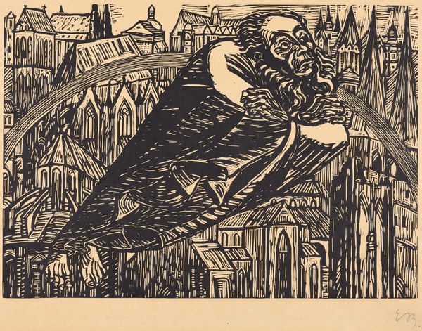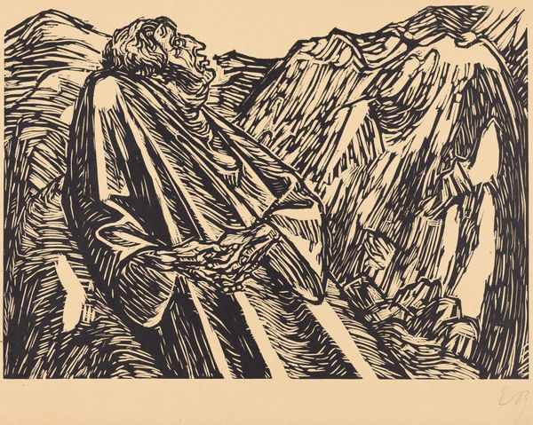 Curator: Let's turn our attention now to Ernst Barlach’s 1920 woodcut, "The Seventh Day". Editor: It strikes me immediately. There's a remarkable sense of stillness conveyed despite the dynamic lines. The texture practically vibrates. Curator: Barlach was deeply influenced by expressionism, and the sociopolitical landscape of post-World War I Germany profoundly affected his artistic vision. This work embodies the period's disillusionment and existential questioning. Editor: You can definitely see that anguish rendered in the graphic weight. Look at how the stark black lines carve out the figure's face. It's both powerful and deeply wearying. The composition is fascinating, too, with the figure almost melting into the jagged peaks around him. Curator: The subject, reclining against the mountainous landscape, is meant to represent God resting after Creation. Barlach grapples here with traditional religious iconography. The print was produced amidst profound societal upheaval and increasing secularism, forcing questions around divine power and intervention. Editor: Yes, and note the contrast between the relatively detailed rendering of the figure and the almost abstract quality of the landscape. The use of the woodcut medium allows for that potent graphic simplification. Each mark feels deliberate and loaded. Curator: Indeed. His choice of woodcut is significant. The stark contrast between the cut and uncut areas heightens the emotional impact. Consider the influence of the Northern Renaissance masters—their focus on graphic clarity. That stark style was, for Barlach, a powerful medium for contemporary concerns. Editor: Absolutely. It's hard not to feel the emotional weight embedded in every line. It’s visually arresting, yet somehow incredibly quiet in its message. Curator: A superb analysis! We often forget art serves a public purpose—this piece prompts that consideration. Editor: Agreed. And analyzing the artistic construction opens many interpretations of feeling.