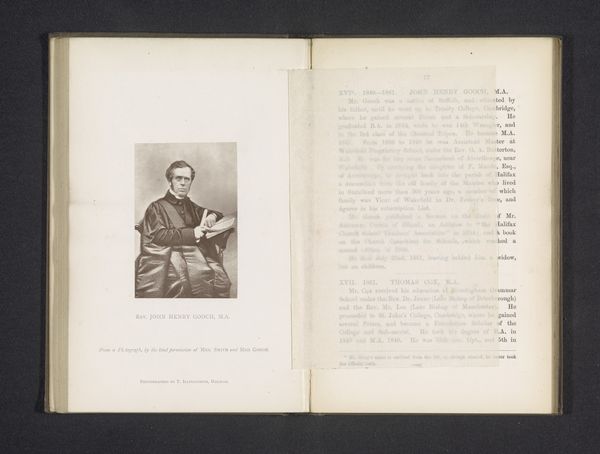 Curator: Let's take a look at "Portret van abt Théofiel Reyn," a photograph integrated into a collage or print from before 1898. What are your first impressions? Editor: Stark. There's an austere quality to it, achieved with high contrast and that very shallow depth of field. The textures within the photograph itself seem deliberately muted to achieve that gravity. Curator: Indeed, there is an intensity in the sitter's gaze and posture. Reyn was an abbot, and the portrait reflects his religious standing but the very printing inside of a book elevates it to some extent beyond a typical photographic study. The symbolic meaning embedded withn its pages tells a more compelling narrative. Editor: Precisely, that relationship interests me—photography employed as a compositional element to the wider layout within the bound page. The graphic flourishes alongside, especially with the bordering text, give the overall aesthetic a more crafted appeal, doesn't it? The photograph feels almost hyper-real but controlled by those deliberate stylistic choices. Curator: You're correct. We see a tension here, with photography in its relative infancy as a means to try to represent truth, harnessed within the very manufactured and deliberately arranged format of a book—as almost an illuminated manuscript in an era defined by new technologies. Consider, then, the symbolic weight of Reyn's likeness within this object; what sort of meaning was it designed to convey? Editor: Perhaps less about precise biographical detail and more about a specific type of authority. The monochrome palette lends gravity while simultaneously suggesting something timeless—even beyond photography's capacity to merely capture what is in front of its lens. Curator: It is compelling how the image carries spiritual connotations by presenting a specific cultural memory through Reyn’s role and function. A portrait imbued with a weight of a sacred office held in devotion. Editor: And that power resides not just in the man or the image but also in its relationship to all these elements which add so much texture— both visual and literal — in concert, giving us not just Reyn's face, but something greater. Curator: An echo across time; the interplay of light, symbolism and composition speaks across generations. Editor: Illuminating the complex interrelation between artistic mediums through intentional, creative decisions.