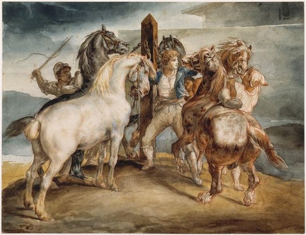 Curator: Here we have a drawing by Théodore Géricault titled "Arabian Stallion led by two Arabians to breed." It's currently housed at the Musée Bonnat in Bayonne, France. Editor: My first thought is of its raw, unfinished quality. The earth-toned hues and the loose linework create a sense of movement and untamed energy, despite being just a drawing. Curator: Exactly. Though rendered in pencil and charcoal, it has the presence and weight one typically associates with oil painting. Géricault masterfully captures the muscularity of the horse, imbuing it with power and a kind of nobility, wouldn’t you say? The image teems with signifiers. Editor: I’d agree. The Arabian horse, particularly within the context of early 19th-century France, held a particular cultural significance. Its elegance and speed represented a connection to the exotic "Orient", embodying a romanticized vision of strength and freedom, values cherished then and now. Is there anything to know about the location, though? The way it is framed… Curator: Absolutely. The drawing features, centrally, an Arabian stallion handled by figures presumably of Arabian origin, most likely in preparation for breeding. The composition reflects, in part, European fantasies about Arabian culture during that period, often projecting onto it images of nobility, simplicity and a close bond with nature. In this sense, Géricault may be critiquing the Western tendency to romanticize and idealize non-European cultures through symbolic images of noble creatures and “exotic” people. Editor: So it’s interesting to reflect upon what the Western artistic traditions say, and, in their selection and celebration, implicitly deem “artistic”. What strikes me, still, is that despite its historical distance and complex cultural connotations, this drawing retains an immediacy. The vitality of the stallion is palpable. Curator: Yes, and the composition itself, with the stallion taking center stage, underscores its cultural and symbolic value. It almost suggests that the animal is more important or dignified than the human figures attending to it. The play of light and shadow, created with minimal lines, contributes significantly to this hierarchical emphasis. Editor: This has shifted my understanding from aesthetic appreciation to critically examining its undercurrents of power and perception. I am more aware of its implications of how cultures viewed each other during the rise of European colonialism. Curator: Precisely! A single drawing, imbued with symbols that reach into our collective past, challenges us to consider whose stories are told, how, and why.