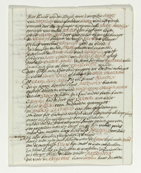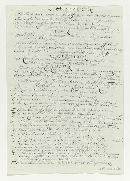 Editor: This document from around 1710, titled “Explanation of the Arminian Serpent,” appears to be an ink drawing on paper, currently held at the Rijksmuseum. It's almost entirely text. What catches my eye is the beautifully stylized handwriting—but honestly, the script makes it hard to decipher! What do you see in this piece? Curator: For me, this work immediately calls to mind the complex tapestry of religious and political conflict in the early 18th century. The serpent is, of course, a loaded symbol – historically representing deceit, chaos, and the fall from grace. Its association with Arminianism, a theological movement, positions it as a visual representation of the perceived threats to orthodox religious and political structures. Editor: So the serpent is meant to be… Arminianism itself? What are those names and phrases throughout the work, then? Curator: Precisely. The text accompanying the image clarifies the serpent's symbolism, acting almost as a key. The handwritten notations, carefully inscribed, likely list individuals or ideas associated with Arminianism, further cementing its connection to specific people and potential ideological challenges to the prevailing order. Editor: It's like a who’s who of the Arminian movement. So the choice of handwriting… it’s not just decorative? Curator: Not at all. The baroque style script, though aesthetically pleasing to our modern eye, functions as a visual signifier of the period, imbuing the work with an aura of authority and tradition. It suggests an attempt to formalize and codify the accusations and critiques against Arminianism. Think of it as a carefully constructed visual argument, steeped in the cultural language of its time. Editor: Fascinating. I initially just saw beautiful writing, but it sounds like everything – the serpent, the text, the script – is working together to communicate a very specific, critical message. It makes you wonder what the intended audience would have made of it! Curator: Indeed, understanding the symbolic language of the past helps us to see how images actively shaped public opinion and negotiated complex historical events.