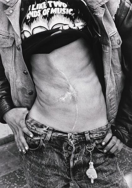 Curator: Jim Goldberg's gelatin-silver print, "Tank," possibly created between 1989 and 1994, presents us with a striking figural composition in monochrome. What's your first impression? Editor: My gut reaction? Unease. The high contrast intensifies the sense of vulnerability—this young man's exposed back and the disturbing markings all convey vulnerability. Curator: The tonality is certainly stark. Consider the composition itself: the figure's stance, the blurred background. It emphasizes the diagonal lines established by his posture, from the curve of his back down through his leg. This compositional tension draws the eye and refuses a point of complete rest. Editor: But where is he? Why is his body presented in this way? This photograph feels loaded with societal narratives. It immediately sparks questions about power, representation, and the male body, especially in the context of late 20th-century America. The black fluid—it recalls concerns of toxicity, contamination, or even violence, considering cultural associations between maleness and violence. Curator: Note how the fluid extends the linear aspects in the image overall: its stark visual relationship to the grain in his blue jeans; how the marks form bold lines against the soft light reflected in the glass of what could be an automobile or the surrounding buildings. Goldberg masterfully juxtaposes the gritty texture against moments of smooth gradation to highlight the subject's form. Editor: Exactly, and considering the artist’s focus on marginalized communities, what narrative are we being invited to engage with here? I read "Tank" as more than a mere aesthetic study. It begs for discourse about masculinity, identity, and perhaps the social anxieties that impacted younger generations, which became subject to Reagan's cutbacks, AIDS epidemic fears, and heightened policing and racial bias. This image, viewed in such a context, pushes past the purely formal considerations. Curator: An engaging counterpoint. I concede that such visual juxtapositions are rarely ideologically neutral, as form itself generates significance. We are left contemplating not only what we see but also how the image encourages the audience to contextualize visual experience through sociopolitical means. Editor: Right. By interrogating these social dynamics with a keen eye, photographic artists urge viewers to reconsider not just the aesthetics but also the power structures embedded in their field.