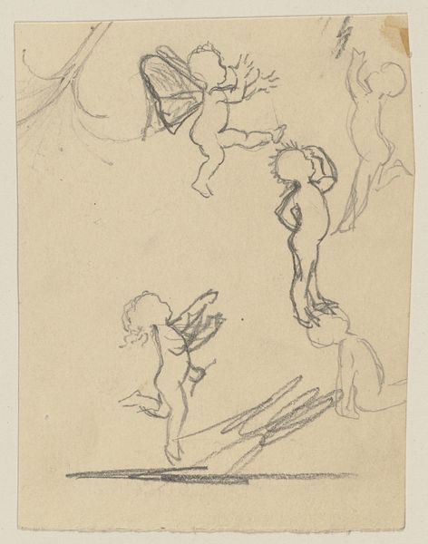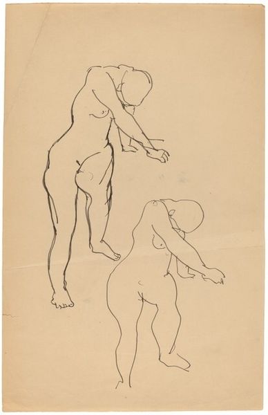 Editor: This is a preparatory drawing titled "Studieblad med knælende mand og stående dreng" by Anne Marie Carl Nielsen, dating from around 1878 to 1940. It’s done in ink, and it depicts two nude figures in seemingly unrelated poses. I find the sparseness and open space really striking. What jumps out at you? Curator: The composition immediately brings to mind the academic exercises of the late 19th century. While presented as a "study sheet," it reflects a growing tension in art institutions. On one hand, the nude form was a foundational element of academic training, tied to historical precedents and the mastery of anatomy. But concurrently, there were rising challenges to these conventions, particularly regarding gender and representation. Consider, who has the power to gaze in this scenario? Editor: So, the male gaze, even in studies like this? Curator: Exactly. Nude studies like these, though presented as neutral exercises, often reinforced the objectification of the human form, historically impacting whose bodies were deemed worthy of artistic representation, and who had the authority to represent them. Was Nielsen explicitly critiquing this? Hard to say without more context. But understanding the academic conventions she was trained in is crucial for interpreting her later sculptural works. Editor: That's a perspective I hadn't considered. Seeing this as part of a larger power structure changes how I view it. I was initially drawn to the apparent simplicity of the lines and figures, but your explanation highlights the complex historical and social forces at play, even in something that seems so straightforward. Thank you! Curator: It also highlights the evolving role of art institutions, which are constantly re-evaluating how they teach and exhibit such works, mindful of these complex legacies. We've both gained a little more insight into this drawing, hopefully, so have our listeners!