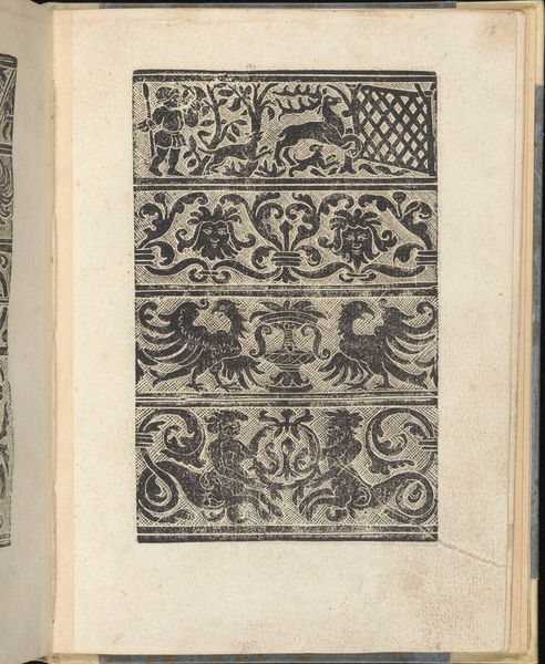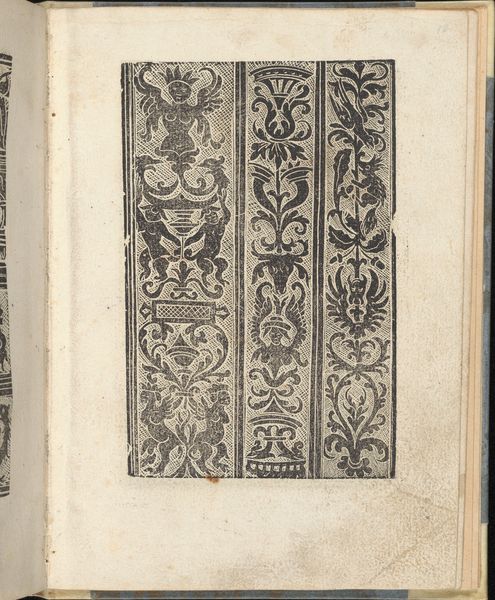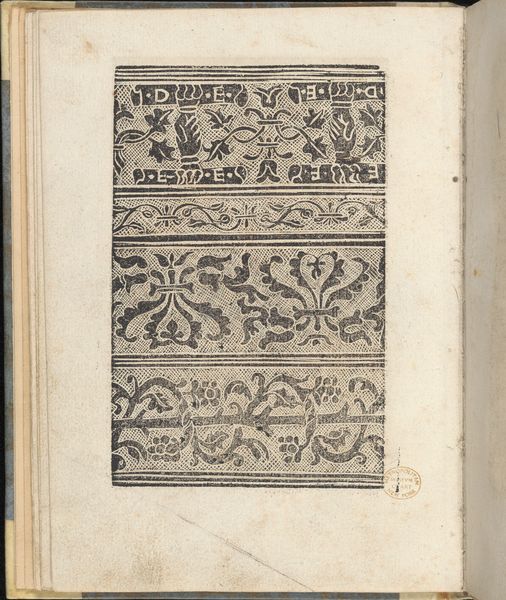 Curator: Looking at this page, there is an immediate sense of the artisanal hand, like the kind that might construct beauty in order to challenge the chaos of existence. Editor: Absolutely. And what we have here is a page from "Ein ney Furmbüchlein," which translates to "A New Model Book". It's page 16, verso, created in the 1520s or 30s, made with woodcut, which really allows the sharp lines and the geometric patterning to come to life. Curator: Indeed! A Model Book; these geometric friezes serve almost as spells to be cast through repetition—to decorate clothing, weaponry or architecture—permeated the everyday lives of 16th century artisans. You feel the cultural weight being transferred through these linear patterns. Editor: Precisely. The Northern Renaissance, unlike its Italian counterpart, grappled with distinct sociopolitical pressures and this book stands as an incredible document for looking at that. The repetitive designs, they are so much more than mere ornament; they become emblems of trade, wealth, and the rising merchant class, who wielded power through carefully coded visual displays. Curator: It's almost hypnotic in a way, isn't it? How these symmetrical forms create a feeling of continuity? It mirrors the human need for order and stability. Like prayers being meticulously beaded together in meditative, and now practical, use. Editor: That feeling, the desire for continuity through patterns speaks volumes about a society undergoing massive transformation, particularly as guilds consolidated economic power, solidifying hierarchies of inclusion and exclusion. It is almost as though the order expressed visually sought to allay, even suppress, anxiety caused by real-world events. Curator: You have it; it shows, if nothing else, that visual language is always embedded and imbued with more than just decorative elements. Editor: Absolutely, it's the intersection of art, social history, and the burgeoning market economy playing out in each precisely rendered line, giving artisans means of both conforming and signaling autonomy. Thanks for helping me unlock all of the historical data buried here. Curator: Always, my friend, the pleasure of symbology is, in part, collaborative.