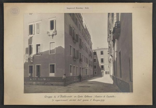 Curator: This photograph, taken by Giovanni Jankovich, documents a municipal tenement building in Venice, part of an “Improved Housing” initiative around 1899. Editor: It looks so austere, doesn't it? Almost like a prison. I wonder if the residents felt uplifted or just...contained. Curator: The materiality speaks volumes. Brick and stone, regimented windows, all mass-produced elements, promising affordable, standardized housing in a city grappling with poverty. Editor: Standardized alright. Where's the Venetian charm, the riot of color, the sense of history seeping from the walls? I feel the loss more than the improvement. Curator: But consider the social impact! Sanitary conditions, stable shelter—Jankovich’s photo captures a crucial shift in civic responsibility and urban planning. Editor: I suppose so. But what about the human spirit? Did beauty get sacrificed at the altar of efficiency? It’s a trade-off I'm not sure I like. Curator: Indeed, reflecting on these images highlights the complexities of social progress and the often-unforeseen aesthetic consequences. Editor: Exactly! It reminds us that good intentions don't always lead to inspiring results. Still, food for thought, definitely.