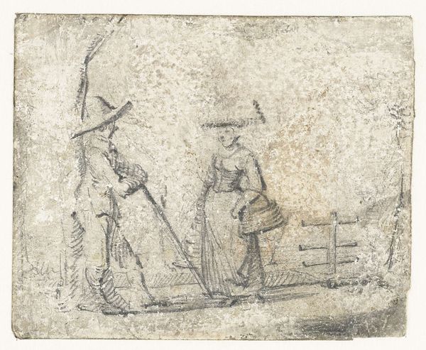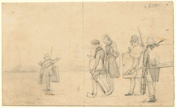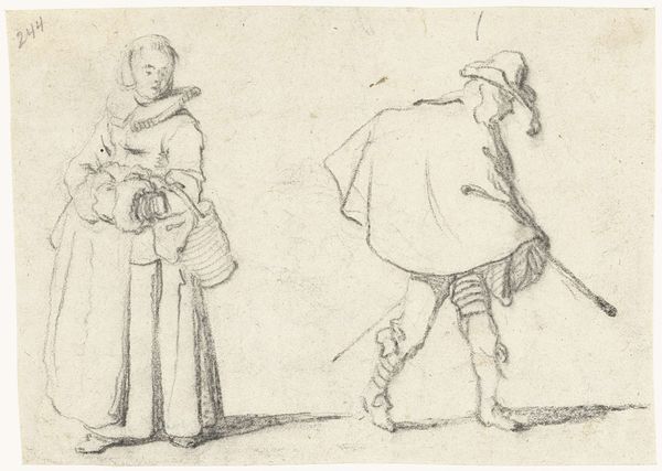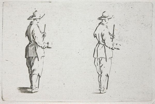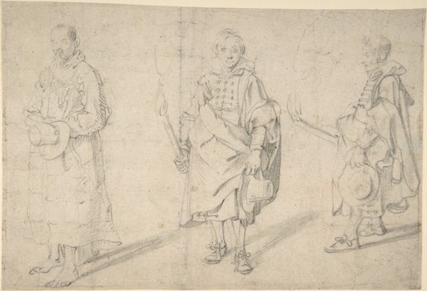 Curator: Immediately, I’m struck by the tentative quality of this sketch. It’s so bare. Editor: Yes, "Three Standing Men," executed around 1653 by Moses ter Borch and currently held at the Rijksmuseum, indeed presents us with a minimalist composition. The medium is pen on paper. Curator: The figures seem so self-contained, almost isolated despite their proximity. The stark lines create a sense of…distance. It is striking how lightly they are described. Editor: Consider the context of Dutch Golden Age art; genre painting and portraiture were incredibly popular. Ter Borch’s drawing enters a cultural narrative obsessed with depicting everyday life. This sketch might serve as a study for a larger composition. It captures the fashion of the era, but not with idealizing intent; the depiction is almost critical. Curator: Indeed, the formal reduction intensifies our attention to the variations in their stance and garb, how the line of the cloaks flow around each one and relate to their relative posture. There's a compelling relationship created by their positioning, the slight lean in one figure countered by the more formal upright stance of another, and their props, their sticks almost bisect the image on the lower half. Editor: It speaks volumes about societal structures, doesn’t it? The props, swords, hats, their posturing... These aren’t mere accessories but signifiers of status and identity, especially if they belong to particular guilds, orders, or militias. I can see echoes of civic guard portraits here. They underscore a deep concern for representation. Curator: Absolutely, though its lack of surface incident amplifies the figures against the neutral backdrop, almost as specimens removed from a narrative. A potent display of their forms alone, and a dynamic expression nonetheless. Editor: Perhaps, what strikes me most is its direct engagement with questions of identity in 17th-century Holland. Ter Borch's art, viewed through its socio-historical setting, provides invaluable insights into the ways people then viewed and presented themselves to the world. Curator: I concur, this concentrated examination of line and form, even in its unfinished state, generates significant narrative weight and emotive expression. It allows the forms to speak directly to the nature of being present. Editor: A testament to how a modest drawing on paper can unveil complex societal relations from centuries ago, truly inspiring.