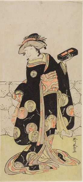 Curator: This woodblock print, housed at the Harvard Art Museums, captures the actor Ichikawa Komazo II in character. Katsukawa Shun'ei rendered it with striking simplicity. Editor: The composition feels quite tense. The actor’s piercing gaze and the rigid lines of his clothing create a palpable sense of anticipation. Curator: Yes, Shun'ei masterfully utilizes costume to convey the samurai's status and the play's narrative context; notice the geometric patterns signifying clan affiliation. Editor: Absolutely. The checkered design, juxtaposed with the soft, stippled fabric, generates a powerful visual rhythm. The artist’s decision to crop the figure also adds to the sense of immediacy. Curator: I agree. And consider the Kabuki tradition itself, where each gesture, each pose, carries symbolic weight, resonating with centuries of cultural memory. Editor: It’s a dynamic interplay of surface and depth, isn't it? Seeing how the artist uses form to construct such a layered image really enriches my understanding. Curator: Indeed, it is a testament to the enduring power of symbols. Editor: Well, it's certainly given me a lot to think about.