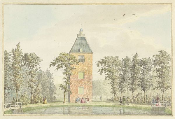 Hendrik de Winter created "Kasteel Moersbergen bij Doorn," a watercolour and pen artwork, now housed in the Rijksmuseum. The composition is defined by its tranquil symmetry and subdued palette, evoking a sense of serenity. Notice how the architectural forms are rendered with precise lines and subtle gradations of color. De Winter masterfully employs the watercolor medium to capture the play of light on the castle's facade and the reflections in the surrounding water. The artist uses structure to convey meaning. Semiotically, the rigid construction of the castle and the reflections of light and shadow can be interpreted as an exploration into power structures. Consider the function of each element within this visual discourse. The horizontal lines of the bridge contrast with the verticality of the towers, creating a delicate balance between human intervention and natural setting. This contrast allows for an interpretation of how power might be transferred in the given setting. Ultimately, the formal qualities of this work extend beyond mere aesthetic appeal, inviting us to consider deeper cultural and philosophical implications.