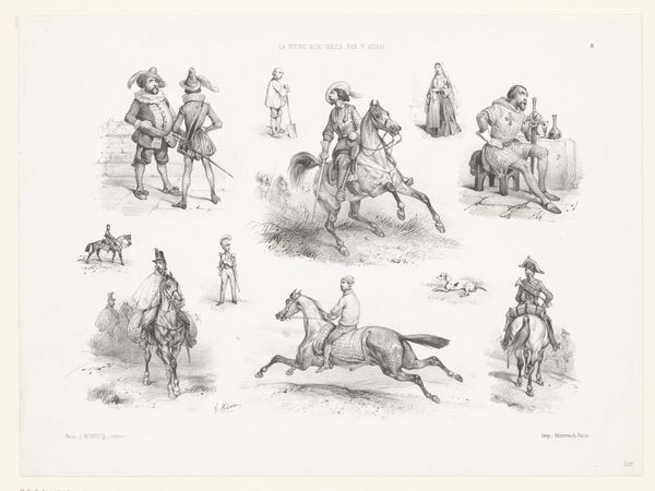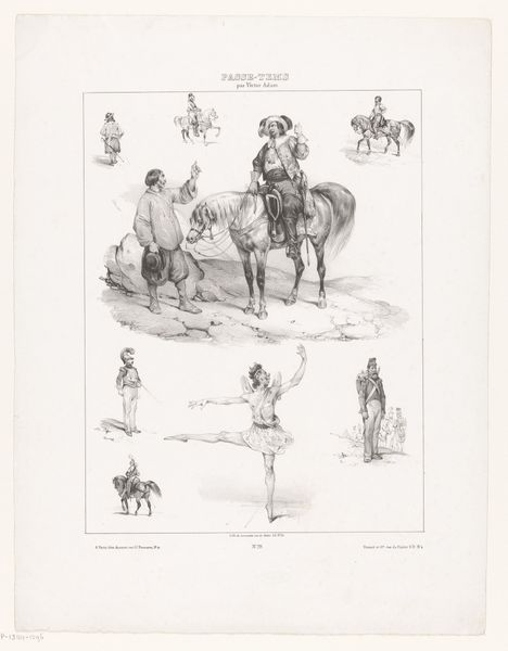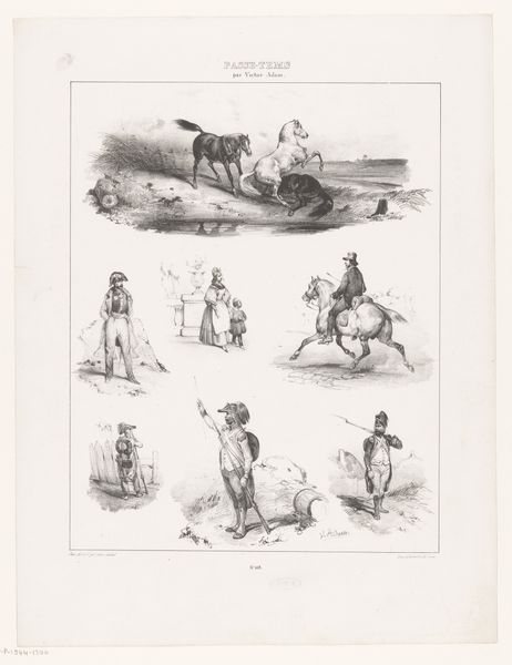 Curator: Here we have "Elf voorstellingen van menselijk tijdverdrijf" or "Eleven Depictions of Human Pastimes" created in 1837 by Victor Adam. It's a pen drawing, currently held here at the Rijksmuseum. Editor: Eleven tiny stages set for a miniature play! The Romantic spirit and academic rigor seem at odds somehow, lending it an almost surreal feel. There is an entire universe implied in the simple linework here. Curator: Observe the artist’s deployment of line and the deliberate organization of figures across the plane. Adam is engaging in a very academic presentation of Romantic ideals. Note how the composition creates a narrative through juxtaposition, inviting a reading of societal pastimes through the formal arrangement itself. Editor: You’re right, the structure is striking. But look at those little figures—there's something slightly tragic, almost comic about the stoic detachment on their faces. Is it a commentary on the emptiness of leisure, on societal roles rigidly performed? Curator: It’s the density of detail rendered in simple lines that intrigues me. Semiotically, each character is not just a person but a symbol, reflecting broader social attitudes. Their stances and garments point toward the complex performance of identity within social hierarchies of the period. Editor: A dollhouse for adults. The entire composition vibrates with potential meanings. Maybe Victor Adam felt alienated from the pastimes of his time, presenting it as a disconnected theatre with miniature puppets playing at grand gestures? Or perhaps it’s more of a wry smile at society. Curator: Perhaps. Ultimately, Victor Adam creates not merely depictions, but structurally organized meditations on society rendered in pure visual language. The aesthetic framework and detailed renderings reflect the period, creating an environment that evokes reflection and scrutiny in equal measure. Editor: I think I came looking at this drawing for pastime ideas, but now I need a stiff drink. In a good way. A brilliant snapshot.