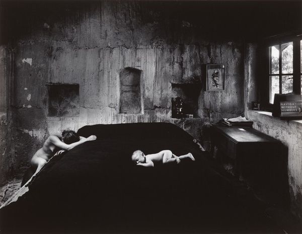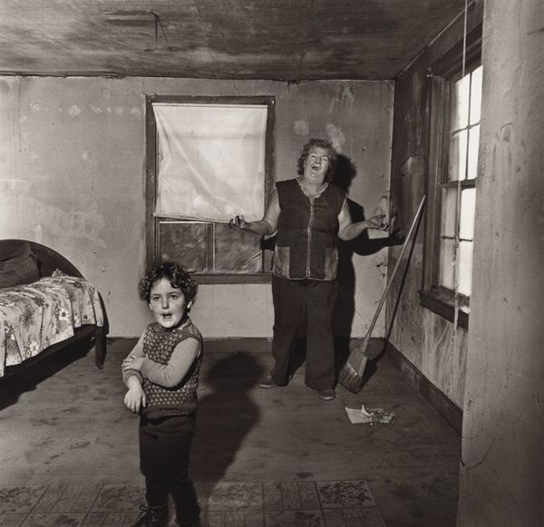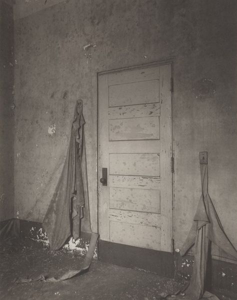 Curator: Oh, the air practically hums with melancholic secrets in this one. Editor: Absolutely. We’re looking at Francesca Woodman’s “House #3, Providence, Rhode Island,” taken in 1976, a gelatin silver print that feels less like a photograph and more like a fleeting glimpse into a dreamscape. Curator: Dreamscape is perfect. The stark monochrome, the peeling walls, and the figure blurred with movement…it all suggests a place suspended between realities. There’s something inherently unsettling yet strangely beautiful about it. The detritus on the floor resembles a scattering of fallen memories. Editor: It's important to contextualize Woodman's practice. She consistently used her own body in her work, often nude or semi-nude, exploring themes of identity, vulnerability, and the female form within patriarchal structures. This image speaks to the historical confinement of women within domestic spaces and the psychological impact of that enclosure. Note how the blurred figure almost merges with the crumbling architecture. Is she trying to escape? Or is she part of the house itself, decaying with it? Curator: Ah, decaying with it! Yes, exactly. There’s a merging of body and space; she becomes an ephemeral inhabitant, a ghost within her own story. It feels incredibly intimate and raw. What's left is almost absence and pure energy. Editor: Consider the socio-economic conditions of Providence, Rhode Island, at the time. The late '70s saw post-industrial decline in many Northeastern cities, creating abandoned spaces perfect as stages for Woodman's explorations. These aren't neutral spaces. The crumbling architecture emphasizes precarity. This could be about dispossession; who gets to be where, whose bodies are deemed valuable. Curator: It's more than decay of building, there's something about what it represents... the breaking down of a promise, of a safe space perhaps? Maybe Woodman felt the same vulnerability with her body as the crumbling home shows to all viewers in its monochrome state. I think that is why the figure and the location in the art merge, even decay, into one piece of creative vulnerability. Editor: This piece makes me reflect about who and what is lost when those societal safety nets erode away. Woodman manages to freeze those questions, those struggles, in a permanent medium, provoking us to question structures of power even to this day. Curator: Precisely, and the beauty of it lies in how it evokes more questions than it answers. Editor: Leaving us, appropriately, suspended in uncertainty.
